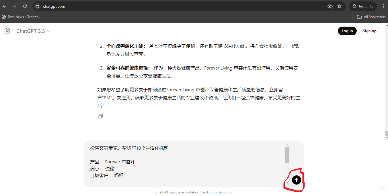 第3步:把copy的文案paste在chatgpt里面,填写产品,痛点,目标客户,名字,背景 然后按有箭头上去的按钮